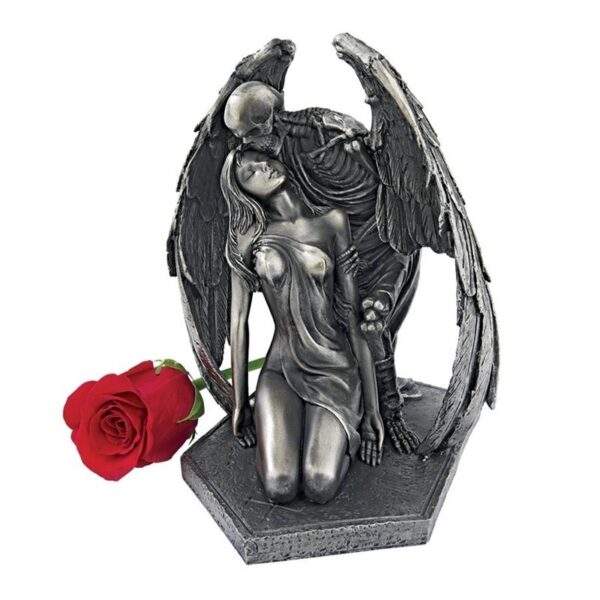 The angel of death swoops down to plant the fatal kiss in this Skeleton statue inspired by Barcelona’s famous 1930 sculpture, “El Beso de la Muerte.” Amazingly sculpted exclusively for Design Toscano, from the wide, weathered wings and bony fingers to the sensual draped fabric of the beautiful victim’s gown, this angel of death statue is cast in quality designer resin with a faux pewter finish to highlight each gallery-worthy detail.