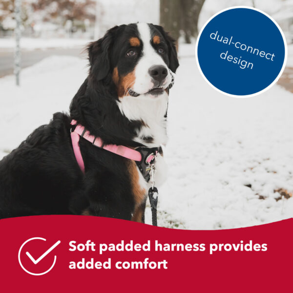 This dual-connect harness features two options for hooking on your leash to train your dog to walk properly. The front connection guides your dog by the chest strap and naturally redirects attention without causing neck strain. Once your dog is walking right, the optional back connection of the harness can be used.
